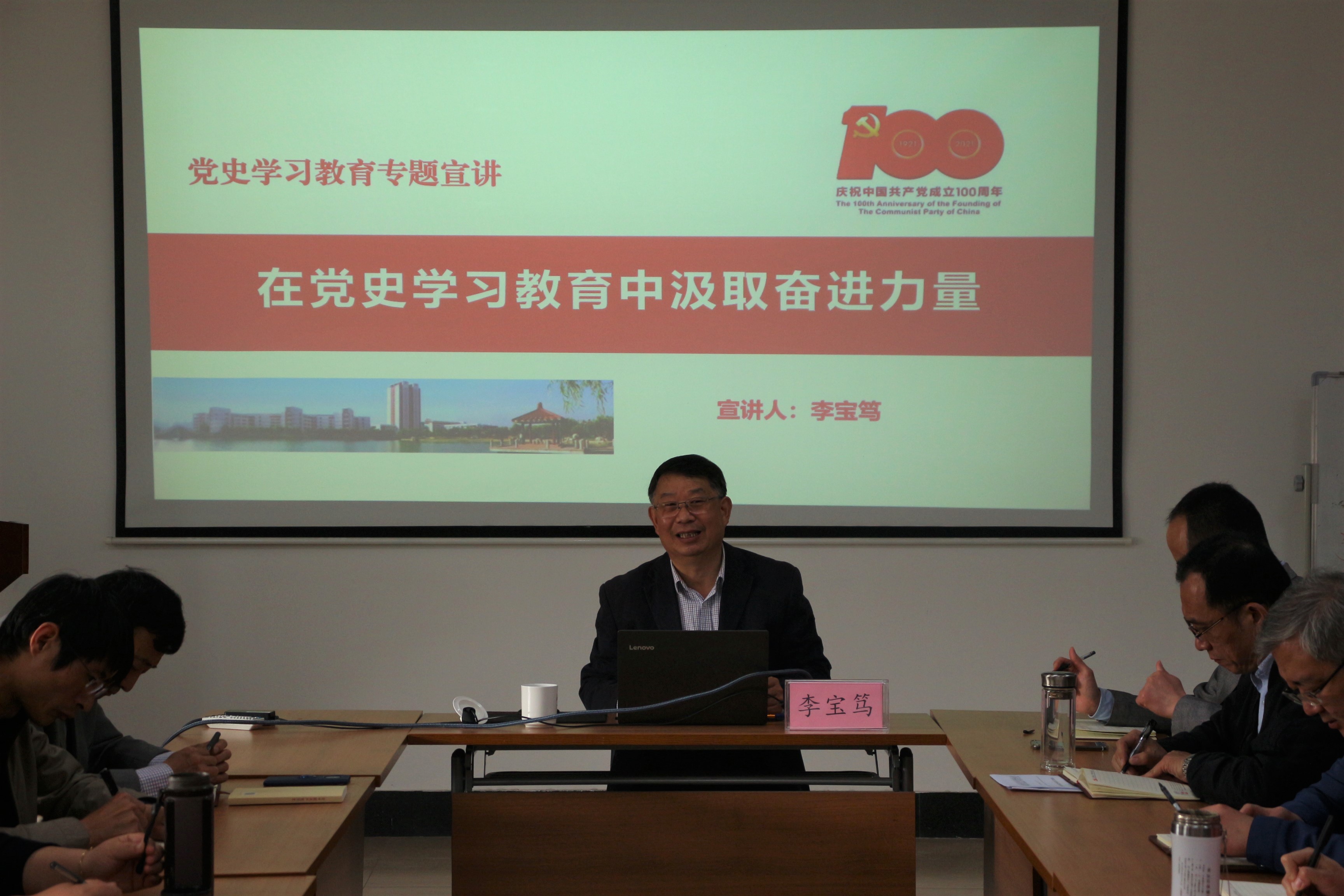 李宝笃在宣讲中强调,要深入学习贯彻习近平总书记重要讲话精神和党中央决策部署,紧密结合学校工作实际开展好党史学习教育。一是要深入学习领会习近平总书记关于党的历史的重要论述,充分认识开展党史学习教育的重大意义。树立正确的党史观,做到知史爱党、知史爱国,在学习领悟中坚定理想信念,在奋发有为中践行初心使命;二是要认真研读党史基本著作,全面了解中国共产党百年奋斗的光辉历程和历史性贡献,深刻认识中国特色社会主义是党和人民奋斗、创造、积累的根本成就;三是要深刻把握开展党史学习教育的重点,通过学习教育,深化对党的性质宗旨的认识,进一步把握历史发展规律和大势,增强用党的创新理论武装全党的政治自觉,增强党的团结和集中统一,发扬革命精神,提高应对风险挑战的能力水平;四是要学懂弄通做实习近平新时代中国特色社会主义思想,增强“四个意识”、坚定“四个自信”、做到“两个维护”。