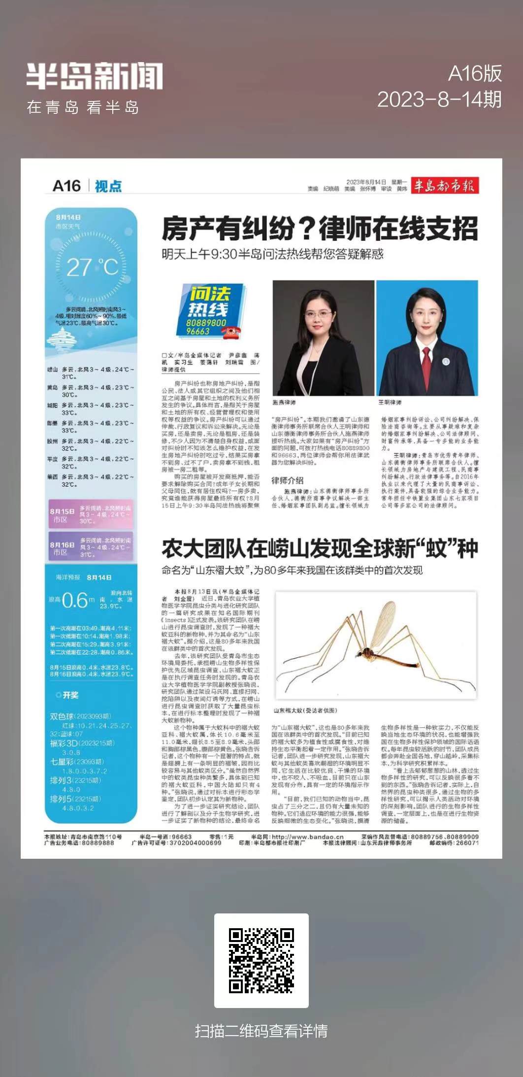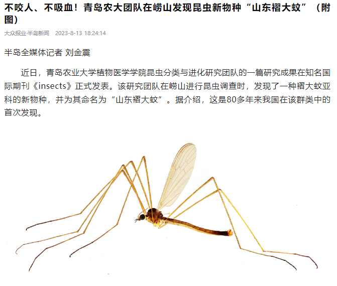 【半岛新闻】近日,William威廉英国昆虫分类与进化研究团队的一篇研究成果在知名国际期刊《insects》正式发表。该研究团队在崂山进行昆虫调查时,发现了一种褶大蚊亚科的新物种,并为其命名为“山东褶大蚊”。据介绍,这是80多年来我国在该群类中的首次发现。
