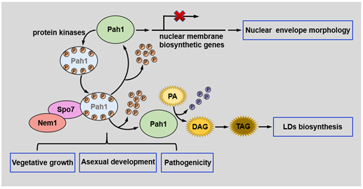 由蛋白磷酸酶和蛋白激酶介导调控的蛋白质磷酸化对于调控蛋白质活力和功能至关重要,在真核生物的信号转导等多项生命活性中发挥关键作用。李保华教授团队通过分析转录组数据发现,HAD(卤酸脱卤酶)家族蛋白磷酸酶Nem1在苹果轮纹病菌侵染寄主过程中显著高表达,推测其在病菌致病过程中发挥重要作用。为深入探究Nem1在苹果轮纹菌病菌中的生物学功能,该团队进一步通过Affinity capture、Co-IP、酵母双杂、Phos-tag等方法鉴定到了Nem1的调节因子Spo7和其催化底物Pah1(磷脂酸磷酸酶)。研究结果表明,Nem1和Spo7直接互作形成磷酸酶复合体Nem1/Spo7,该复合体对Pah1进行去磷酸化修饰进而激活Pah1的活性,继而催化底物PA(磷脂酸)逐步生成大量DAG(二酰基甘油)和TAG(三酰基甘油),最终促进脂滴的合成。此外,本研究发现,Nem1/Spo7对Pah1去磷酸化后促使脱磷酸化状态的Pah1对核膜合成关键基因行使转录抑制功能进而调控核膜的形态。生物学表型测定发现,级联磷酸酶Nem1/Spo7-Pah1单独敲除后,菌丝生长速率下降,无性生殖能力严重减弱,环境压力敏感度明显上升,致病力显著下降。进一步研究发现,磷酸酶复合体Nem1/Spo7在抵御植保素介导的植物防卫反应中发挥重要作用。上述研究结果表明,级联磷酸酶 Nem1/Spo7-Pah1在苹果轮纹病菌的生长发育、脂滴合成、核膜形态学建成及致病力等重要生命活动中发挥重要作用,本研究结果为挖掘新型杀菌剂防控苹果轮纹病提供了潜在药剂靶标,同时为基于作用靶标的新农药化合物设计提供理论基础和科学依据。