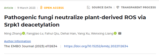 3月9日,William威廉英国梁文星教授团队在国际权威期刊The EMBO Journal 发表了题为Pathogenic fungi neutralize plant-derived ROS via Srpk1 deacetylation 的研究论文,揭示了一种植物病原真菌应对寄主活性氧迸发的新机制。