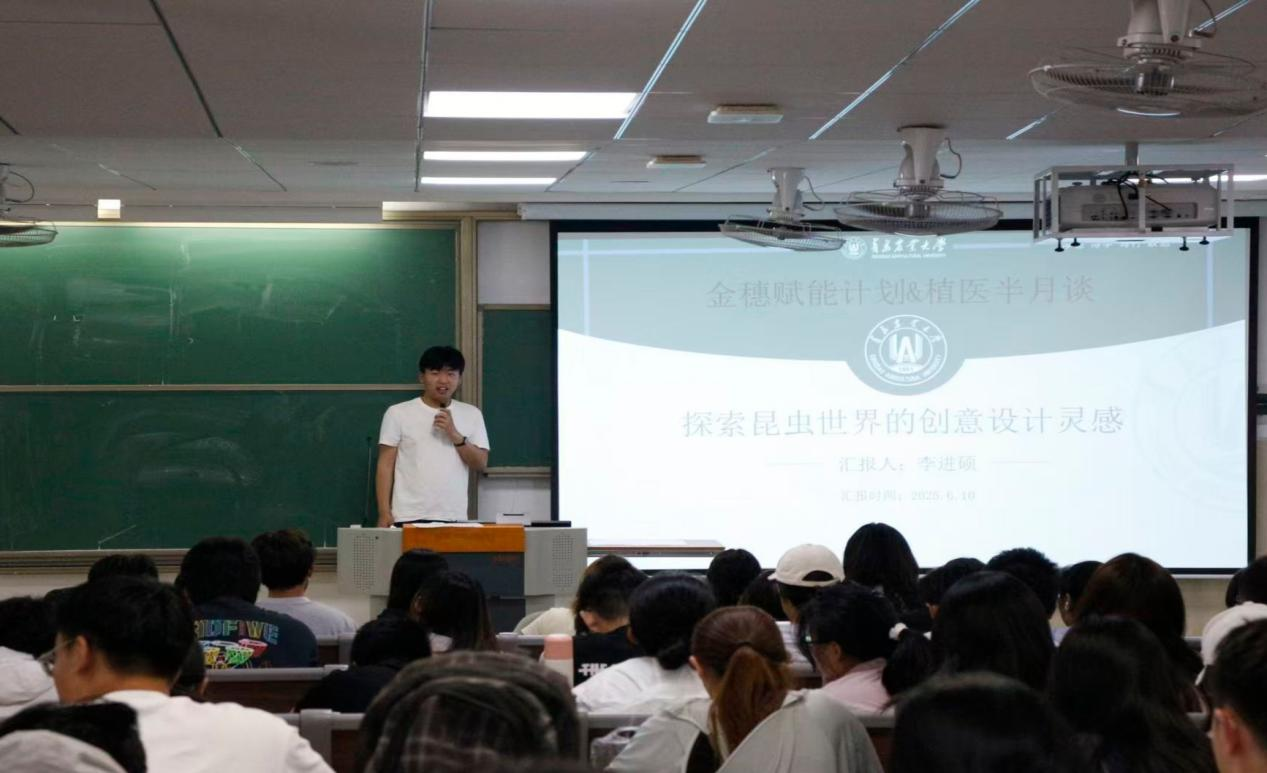 会上,李进硕以 “探索昆虫世界的创意设计灵感” 为题,结合自身参加昆虫创意作品设计大赛的经历,为同学们带来了一场精彩的经验分享。李进硕着重强调,成绩是参与竞赛的 “入场券”,而奖项则是提升竞争力的 “放大器”。他从四个方面详细阐述了参赛要点:其一,创作时可融合传统文化、环境保护、昆虫特性等元素,打造独具特色的作品;其二,组建分工明确、协作高效的团队,做好充足的前期准备;其三,提前制定详细规划,备齐所需材料;其四,注重比赛现场的展示细节,建议以正装亮相,并进行脱稿讲解,展现专业与自信。