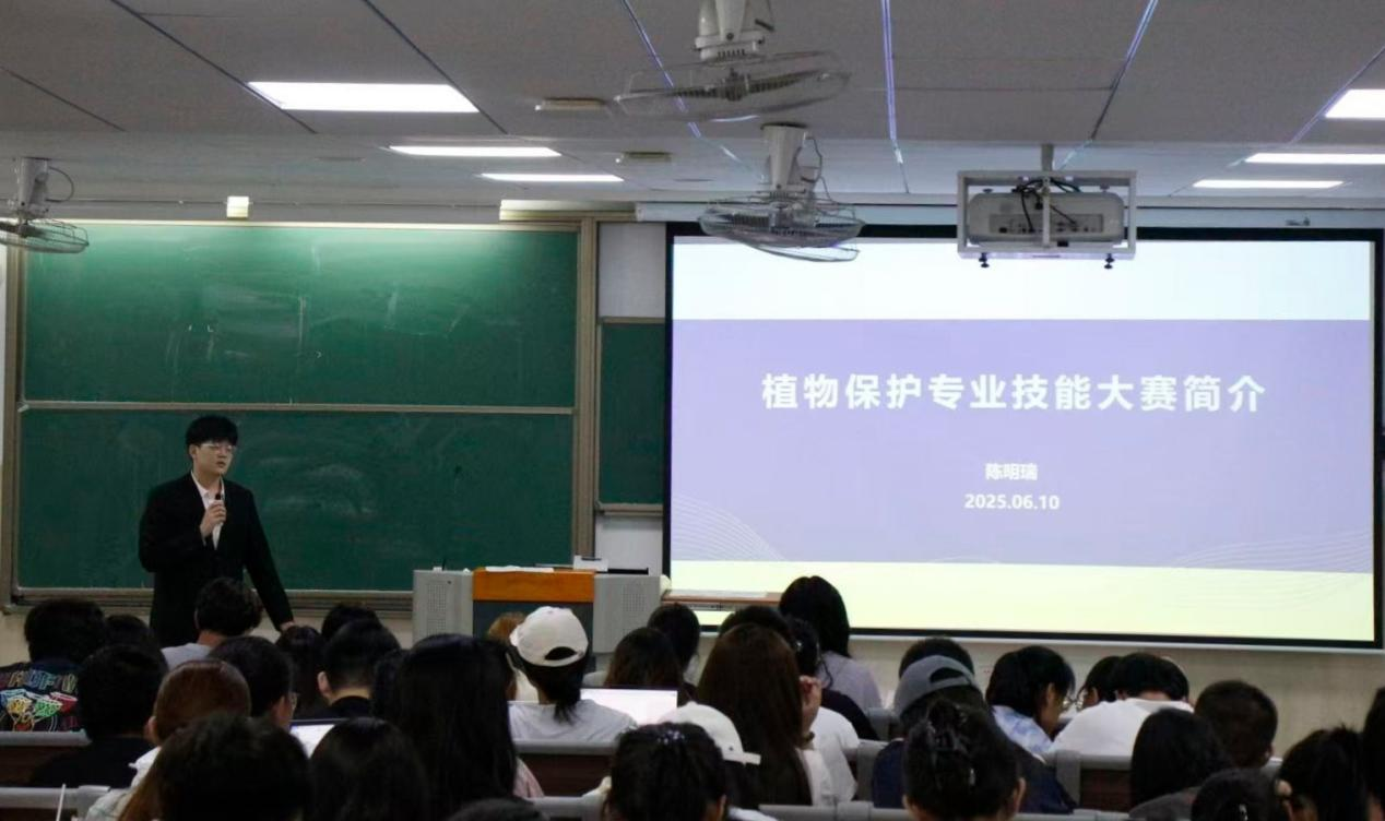 陈明瑞则围绕植物保护专业技能大赛展开分享。他先介绍了大赛的基本概况,列举了学院历届学生和团队在该赛事中取得的优异成绩,随后对竞赛模块的具体内容进行了细致说明。最后,陈明瑞将参赛意义总结为 “锻炼能力,建立自信,开阔视野,提升层次” 十六个字,让同学们深刻认识到参与学科竞赛的价值。