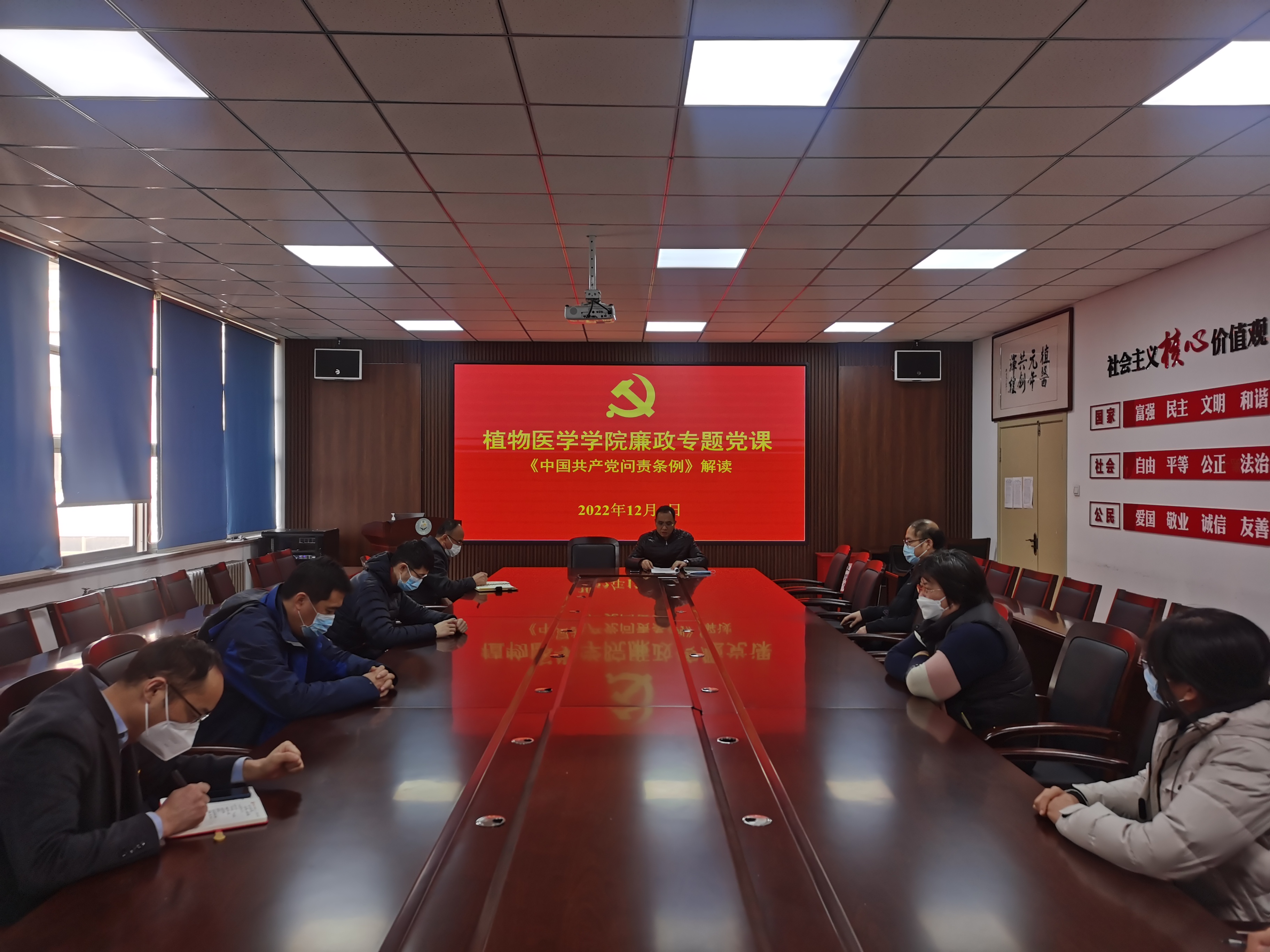 会上,全体成员集体学习《中国共产党问责条例》。结合学院工作实际,韩强对做好学院党风廉政建设工作提出了明确要求:一是把“两个维护”作为根本原则和首要任务,要督促学院党委敢于问责、善于问责,推动学院党组织和党的领导干部负责守责尽责;二是细化问责主体,压实政治责任,明确学院党委应当履行全面从严治党主体责任,真正做到失责必问、问责必严;三是分清责任归属,坚持错责相当,要坚持问题导向,注重精准问责,强化责任担当,防止向下推责,勇于担当、敢于负责;四是丰富问责情形,提出更高标准,全面贯彻党的政治建设、思想建设、组织建设、作风建设、纪律建设,把制度建设贯穿其中,深入推进反腐败斗争;五是健全规范程序,科学严肃问责,要强化上级党组织对问责工作的领导和监督;六是严管厚爱结合 激励担当作为,要督促党组织和领导干部强化责任意识。