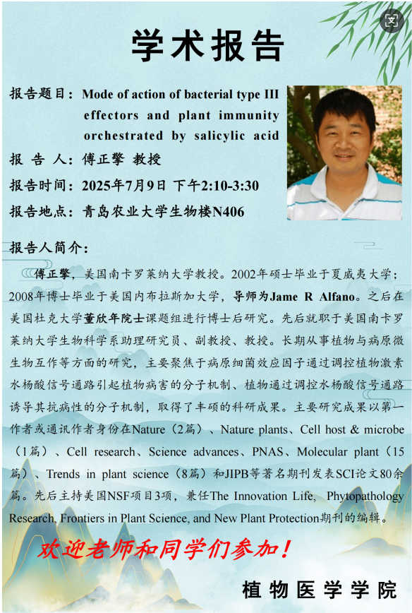 讲座预告:Mode of action of bacterial type III effectors and plant immunity orchestrated by salicylic acid
