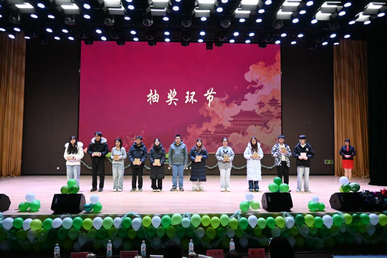 此外,晚会设置抽奖环节和问答环节,获奖选手依次登台领奖,与学院领导共同合影留念。