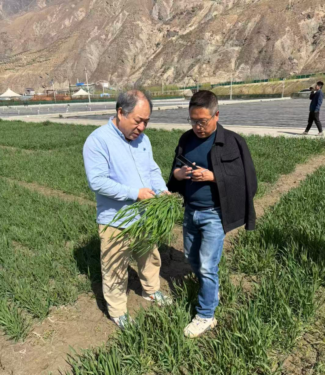 图2:吕昭智教授(左)与陇南市农技推广总站植保科科长马雲(右)在田间商讨小麦病虫害情况