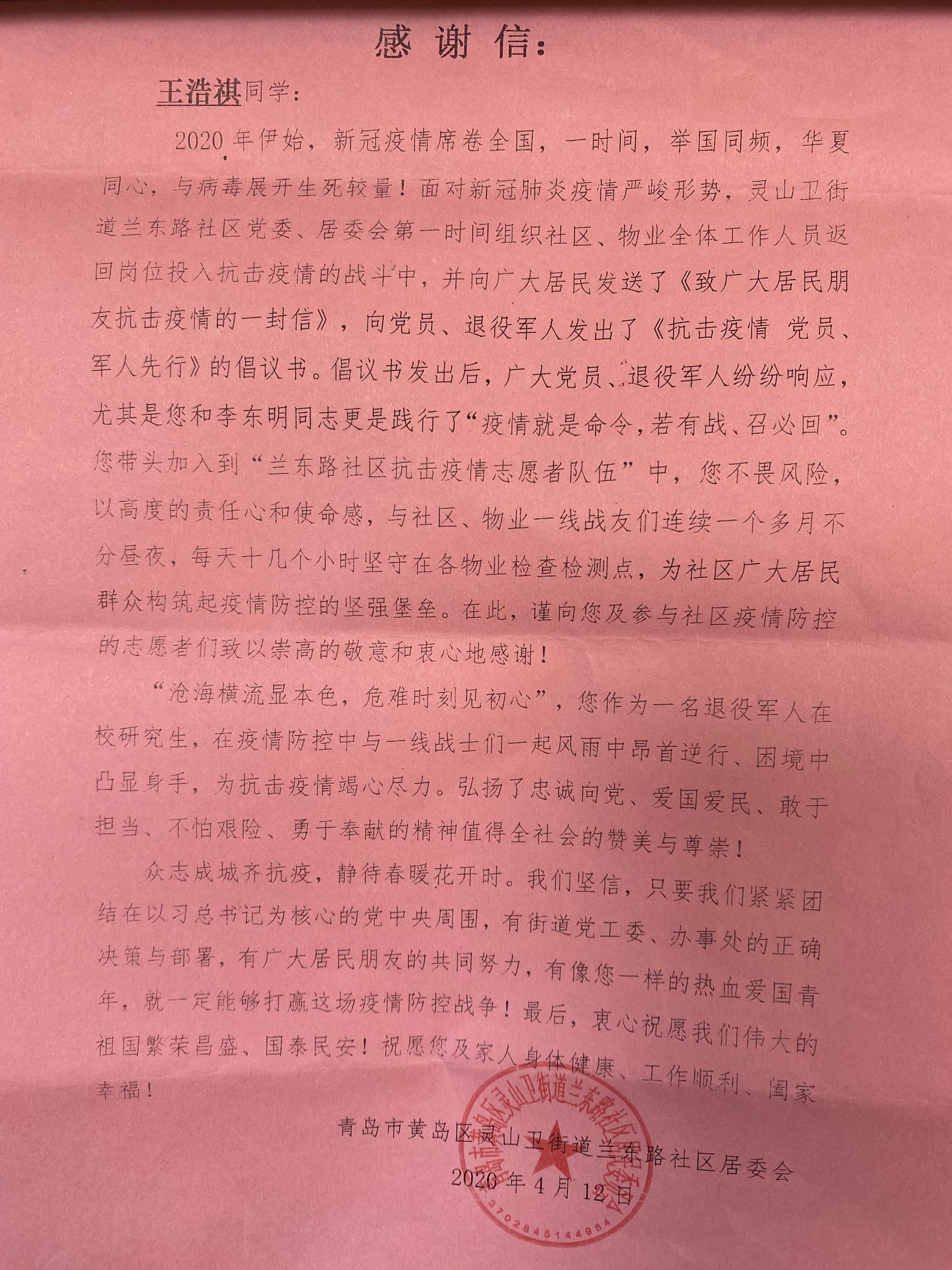 感谢信中指出,面对新冠肺炎疫情的严峻形势,作为一名退役军人及在校研究生的王浩祺积极响应号召,自愿带头加入到“兰东路社区抗击疫情志愿者队伍”中,不畏艰险,以高度的责任心和使命感,与社区、物业一线战友们连续一个多月不分昼夜,每天十几个小时坚守在各物业检测点,对所有进出社区的人员进行登记检查并测量体温以及物资的搬运等,减轻社区发生传染病毒的几率,为社区广大居民群众构筑起疫情防控的坚强堡垒。在此期间,王浩祺收获颇多,他表示,作为一名退役军人,“若有战、召必回”是我的职责,疫情来袭,积极响应党组织的号召,为社会,为人民做一些力所能及的事,是理所应当的。王浩祺的志愿服务精神在这个不寻常的寒冬温暖和感动着社区中的每一位居民,为取得疫情防控的最终胜利贡献了自己的青春力量。