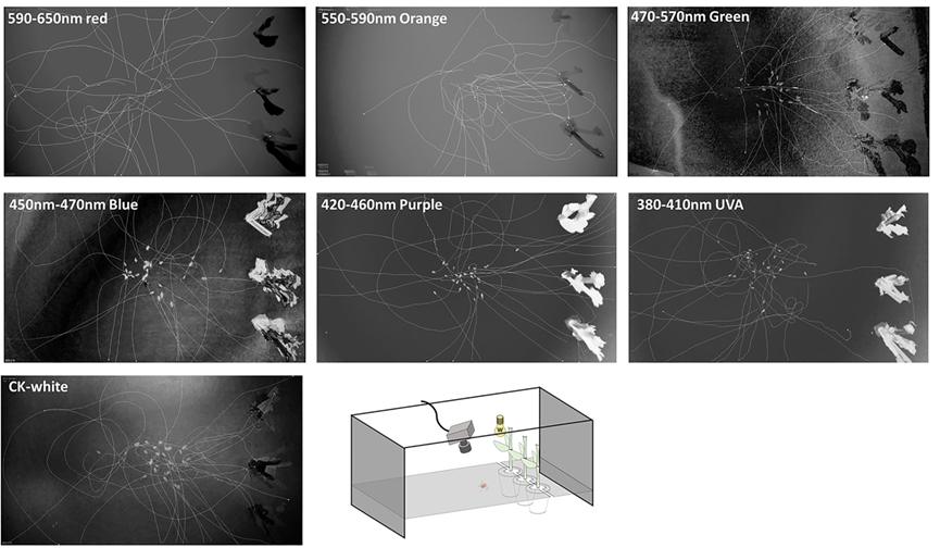 在第一项研究中,团队设置了UVA、紫、蓝、绿、黄橙、红等多种窄带LED光源,并以白光为阳性对照、黑暗为阴性对照,通过行为观测平台、轨迹追踪软件和分子生物学技术,从行为表现和基因表达两个层面,全面解析了不同光照环境对蚜虫的影响。