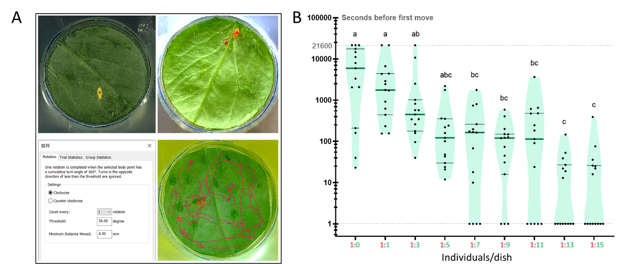 研究二中巧妙利用红绿双色豌豆蚜系统,通过绿色蚜虫控制密度控制变量,单独追踪反差明显的红色蚜虫的行为模式,精确获取到了不同密度下个体行为的转变规律。研究发现,蚜虫的行为反应呈“阈值触发”模式:当种群密度超过1.25头/cm²时,蚜虫由定居状态转向活跃扩散,移动距离显著增加,繁殖能力下降。蚜虫的定植策略也与此相关,但是触发策略转换的密度阈值方面存在差异。