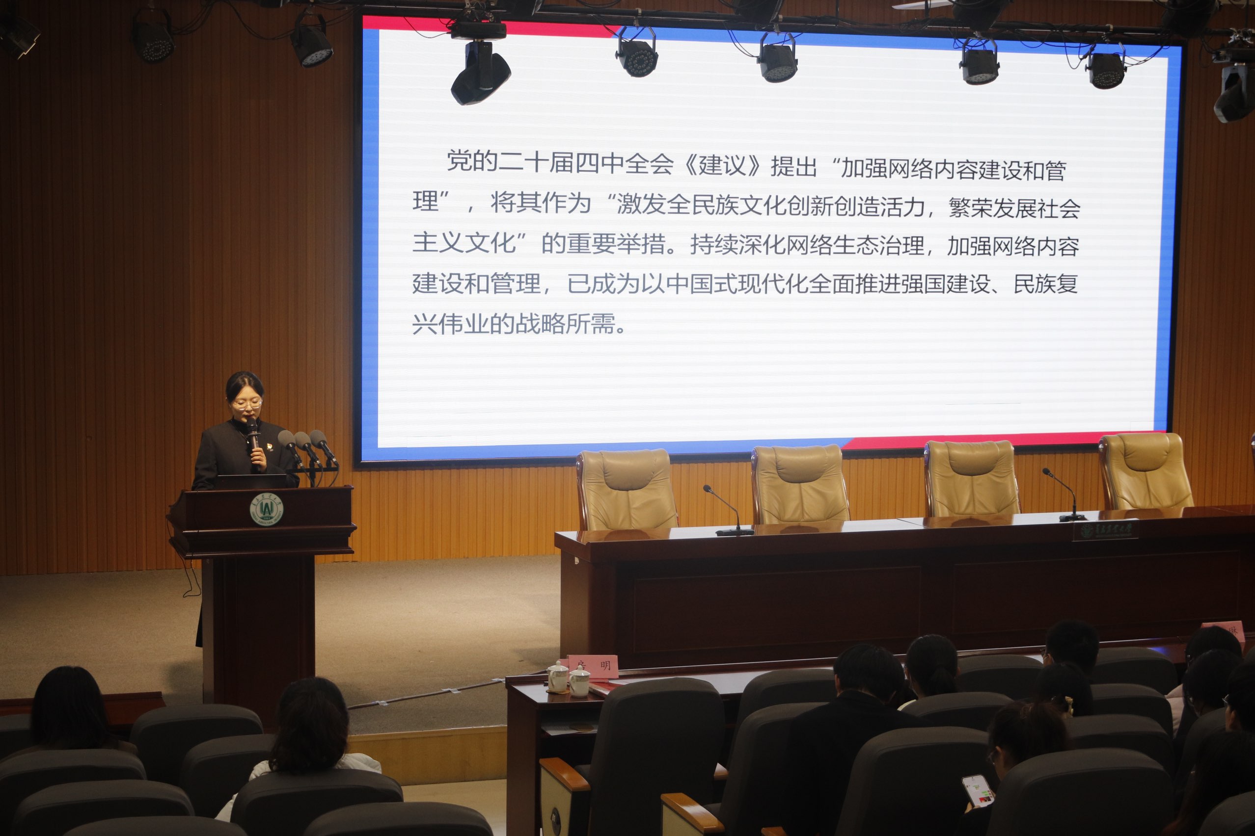 会上,王玮琦通过理论阐释和案例分析的方式,引导全体同学一是要理性看待网络热梗,明辨热梗危害,认清热梗本质,摆脱“梗”式依赖,通过表达训练提升沟通能力,让对话更有深度;二是要坚决抵制网络暴力,认清网络暴力的严重危害,严守法律底线,既要筑牢自我防护防线,也要守护身边同学,做网络文明的“传播者”。
