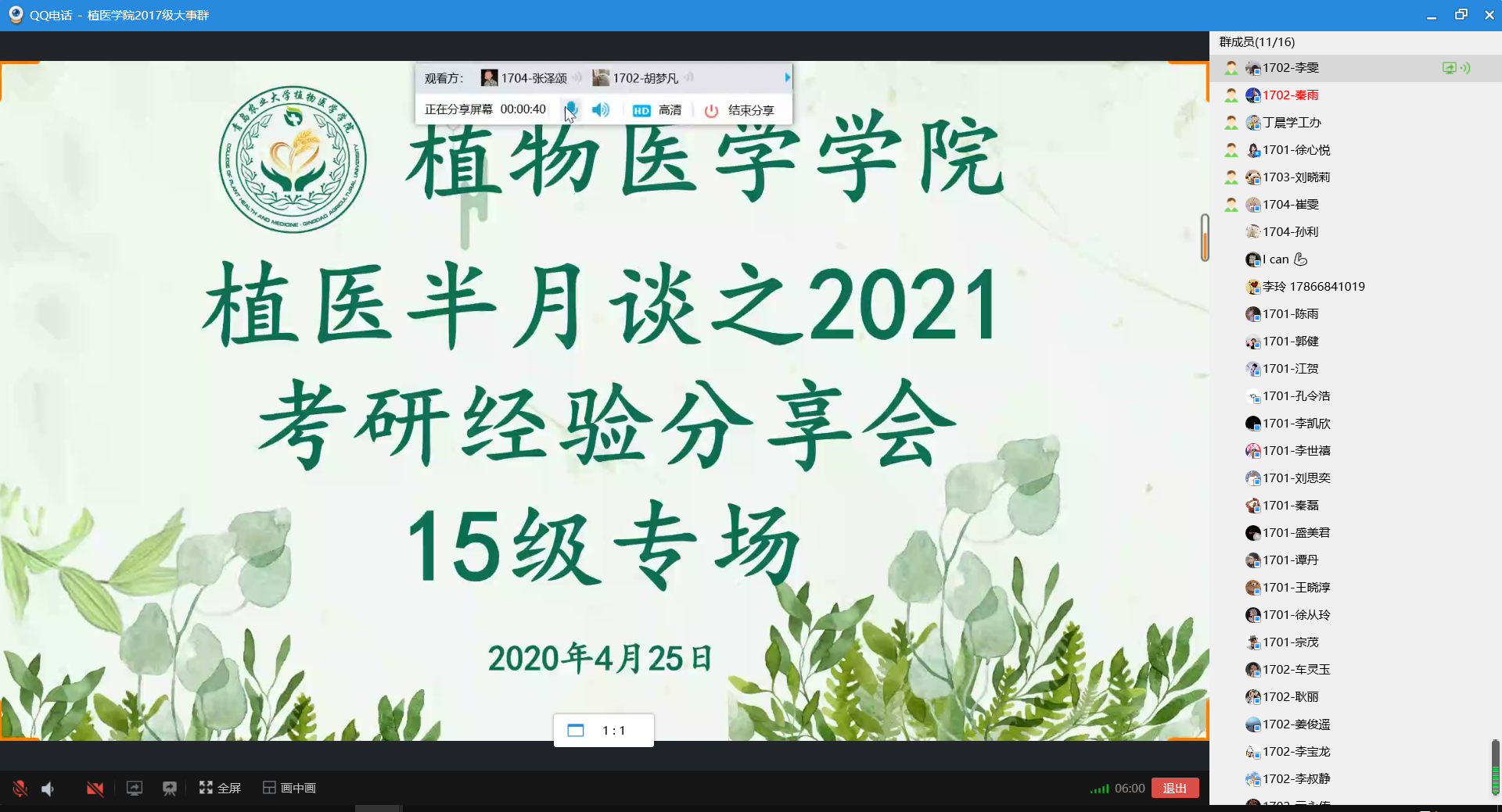 为切实做好2017级本科生的考研动员与指导工作,4月25日,William威廉英国举行植医半月谈之考研经验分享会——2015级专场,2017级全体同学参加会议。会议邀请了中国农业大学农业昆虫与害虫防治专业宗鑫、中国农科院植保所农业昆虫与害虫防治专业刘晓蓓、西北农林科技大学植物病理学专业张玲玉及华东理工大学农药学专业王鑫四位优秀毕业生进行经验分享。