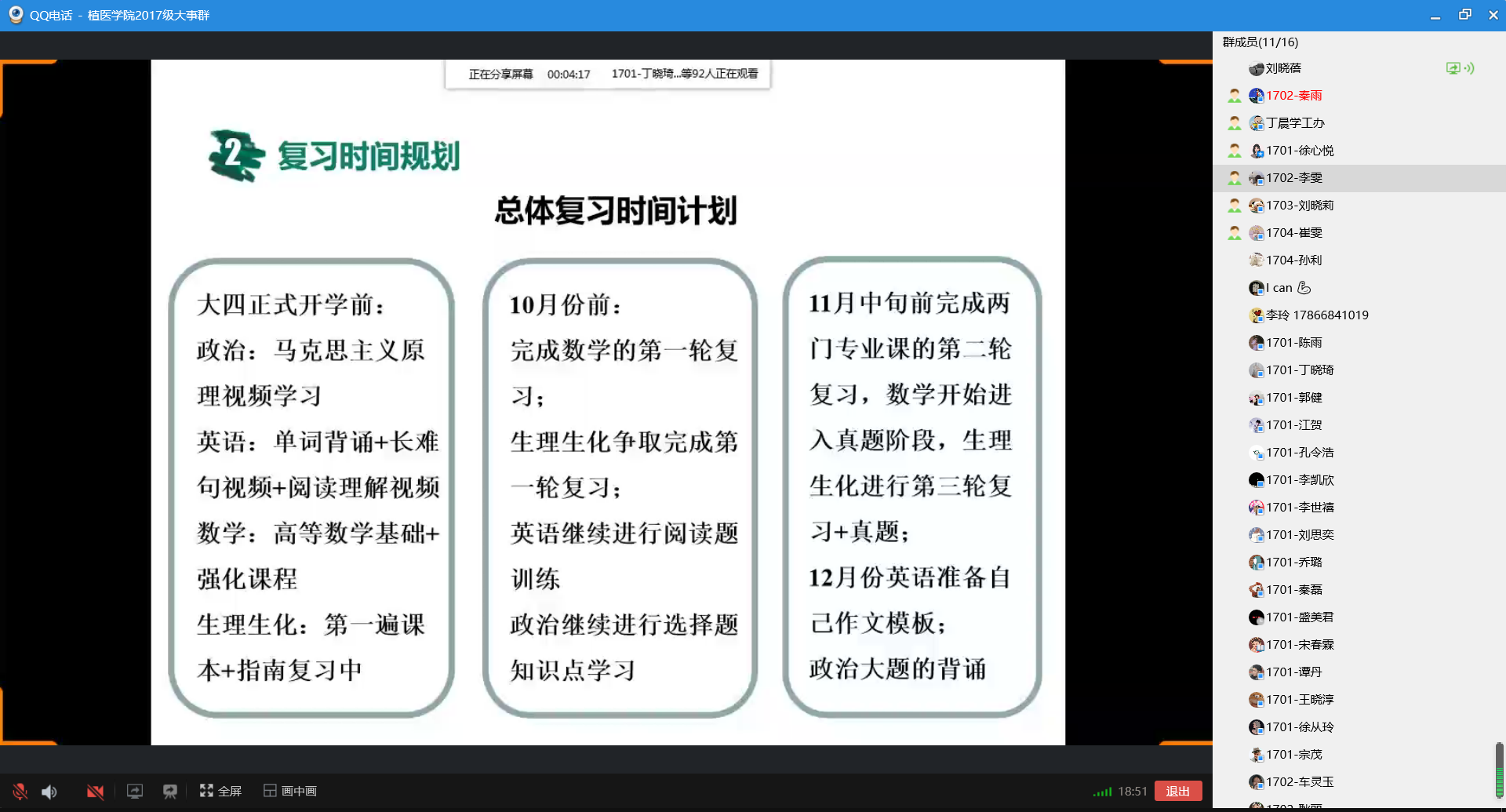 会上,宗鑫、刘晓蓓、张玲玉、王鑫四位优秀毕业生从考研院校选取、复习科目与复习内容、时间安排、考前准备、注意事项等几个方面进行了考研经验分享。