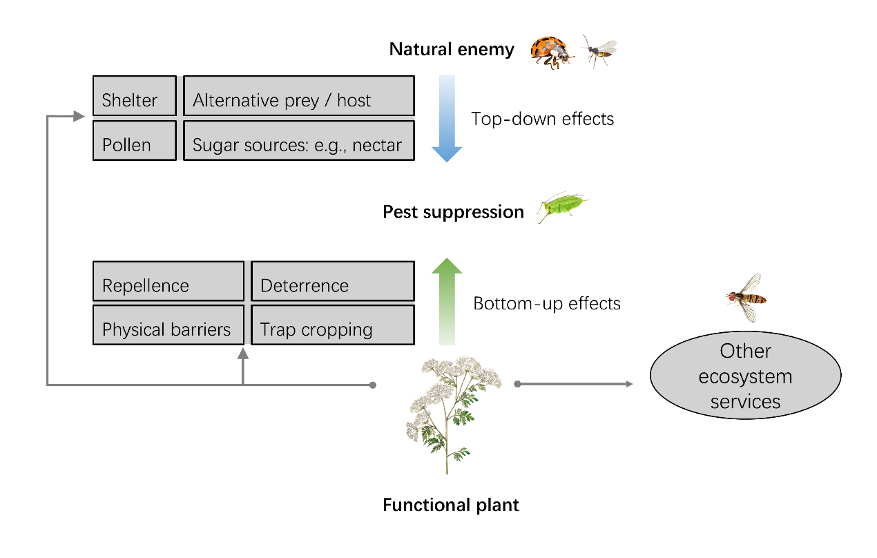 论文进一步将功能植物视为一种生态工程工具,从多营养级(multitrophic)视角解析其调控害虫种群的作用路径。作者总结了功能植物通过直接抑制害虫(如生物活性物质或寄主替代)以及间接增强天敌作用的两类主要机制,并指出其在促进传粉、改善土壤健康和辅助杂草管理等方面的多重生态功能,为单一作物系统向多功能农业生物多样性转型提供了理论依据。