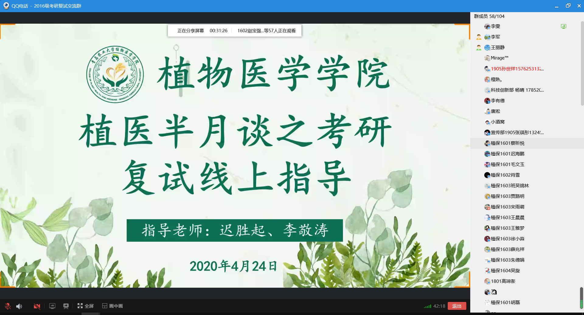本次考研复试线上指导会议,旨在帮助考生深入了解复试流程,明确复试注意事项,有重点、有效率、系统全面的完成复习准备。推动学生进一步掌握了复试应试技巧,坚定考生信心,以积极乐观的心态迎接考研复试这一挑战。本次植医半月谈之考研复试线上指导会议为考研复试专场第二场,学院后期还会邀请多位优秀毕业生及导师进行经验分享,切实做好学生的考研指导工作。