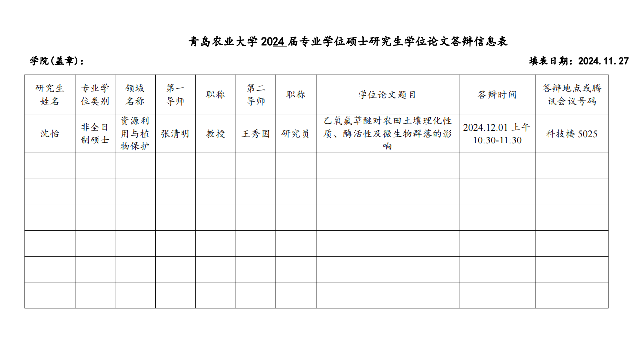 资源利用与保护专业学位硕士研究生学位论文答辩信息